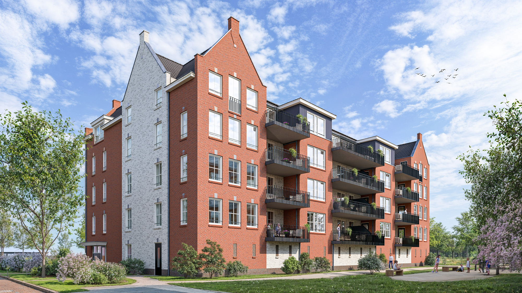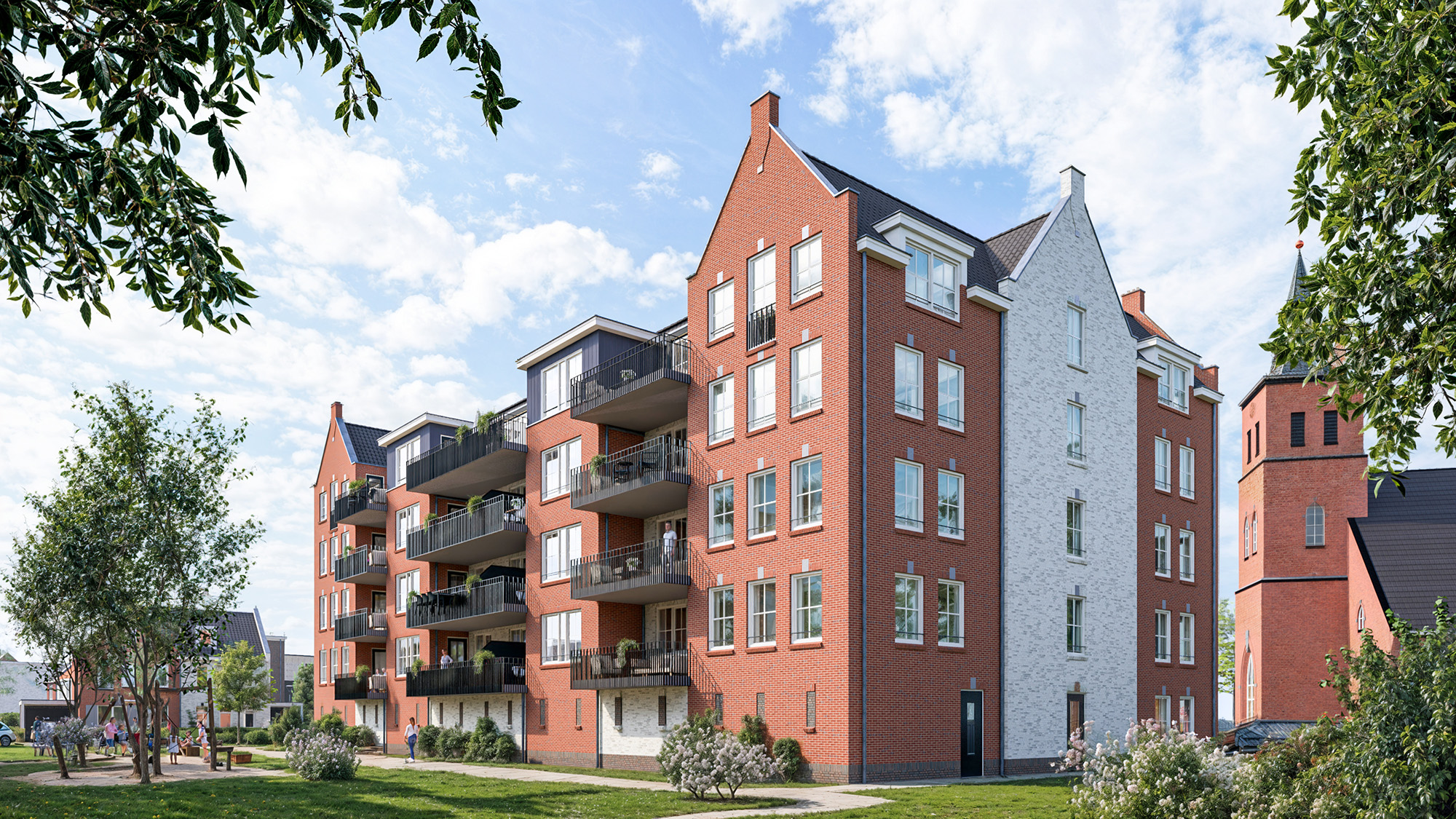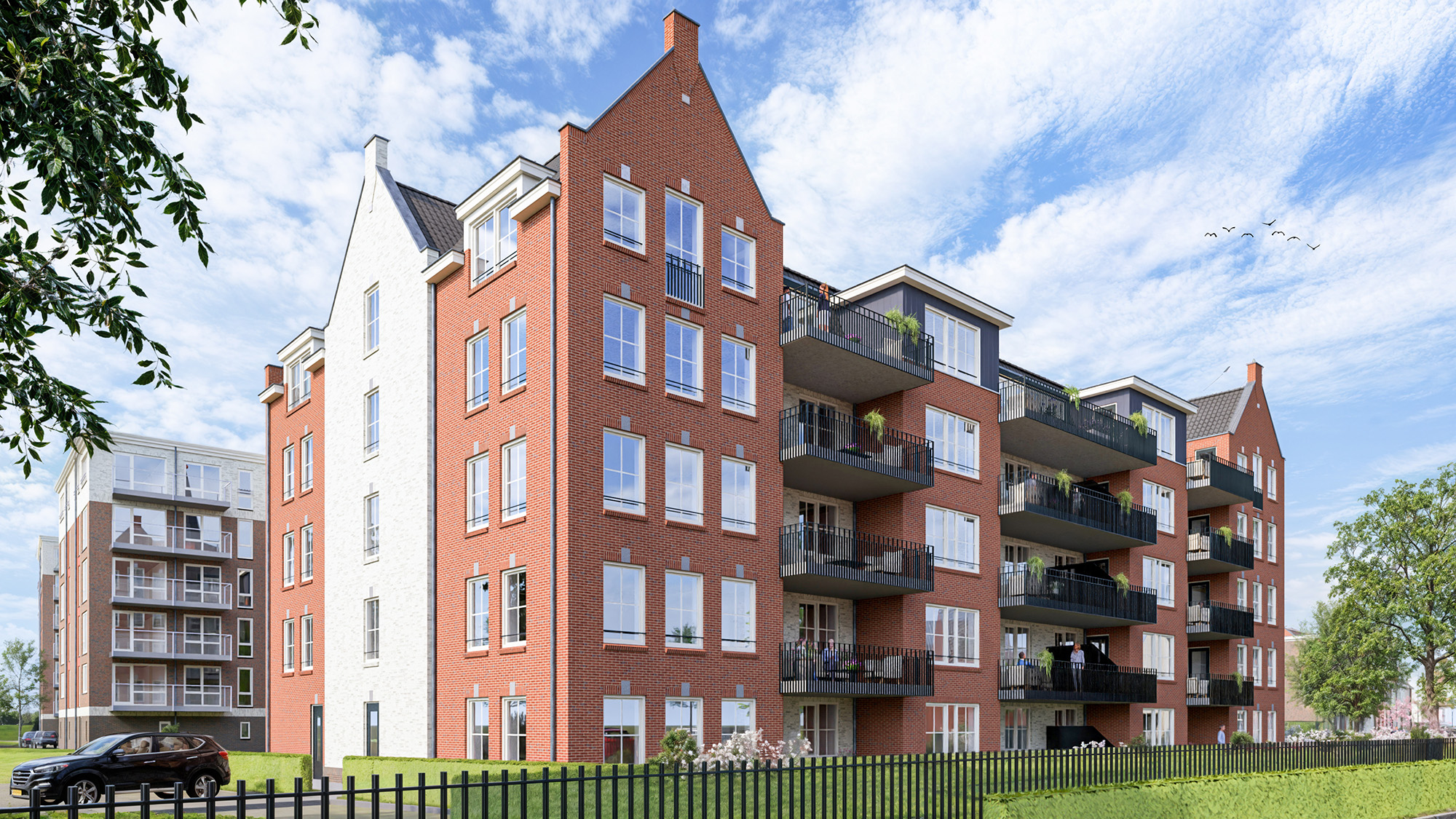 Gebouw Boomgaarde is zorgvuldig ontworpen geheel in lijn met de diversiteit van de omliggende woningen. Met een wisselende kleurstelling van de gevels en de verschillende dakvormen, kunt straks heel goed uw droomappartement in Boomgaarde onderscheiden. Grote uitkragende balkons en royale terrassen op de begane grond geven u de ruimte om ook uw bezoek in een sfeervolle buitenruimte te ontvangen